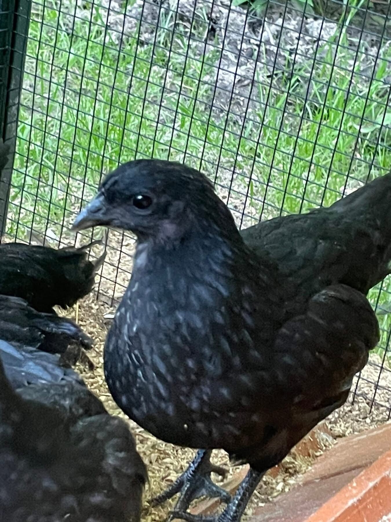 A hybrid creating a puffy cheeked fibromelanistic bird. As adults, these birds display striking fibromelanistic traits—dark skin, legs, and combs—paired with unique, eye-catching plumage colors in either black or blue. Hens lay light seafoam blue to pistachio green eggs and are known for their hardy nature, active personalities, and dependable production, making them a standout choice for backyard flocks.